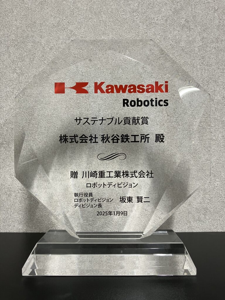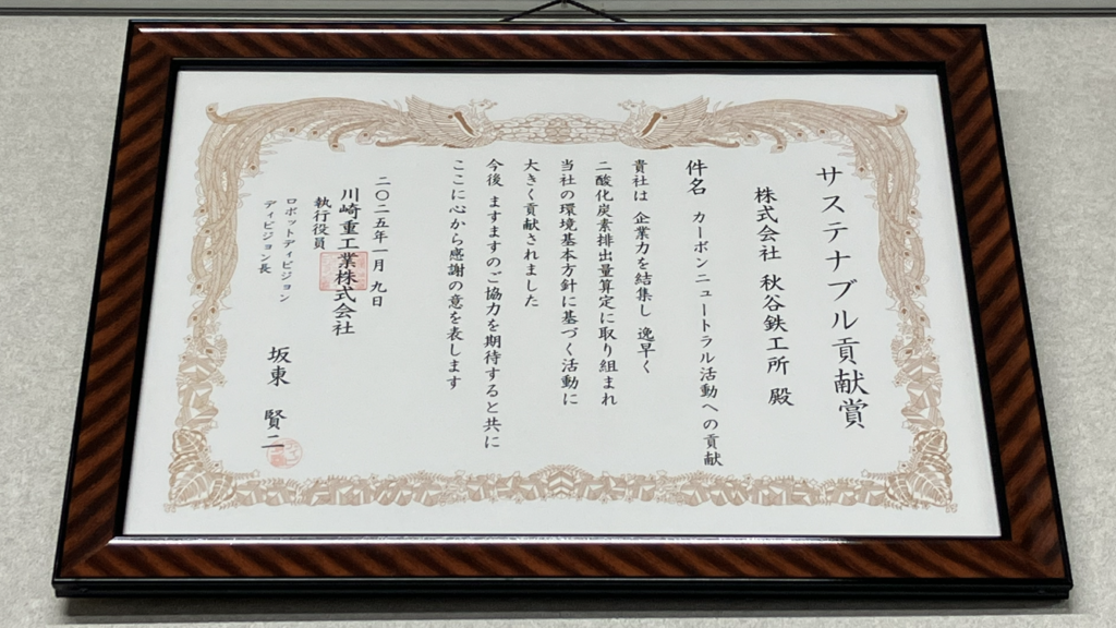 川崎重工業様より、カーボンニュートラルへの活動にご評価をいただき、第一回サステナブル貢献賞として当社が選出されました。当社活動にご評価いただけましたこと、大変嬉しく思います。